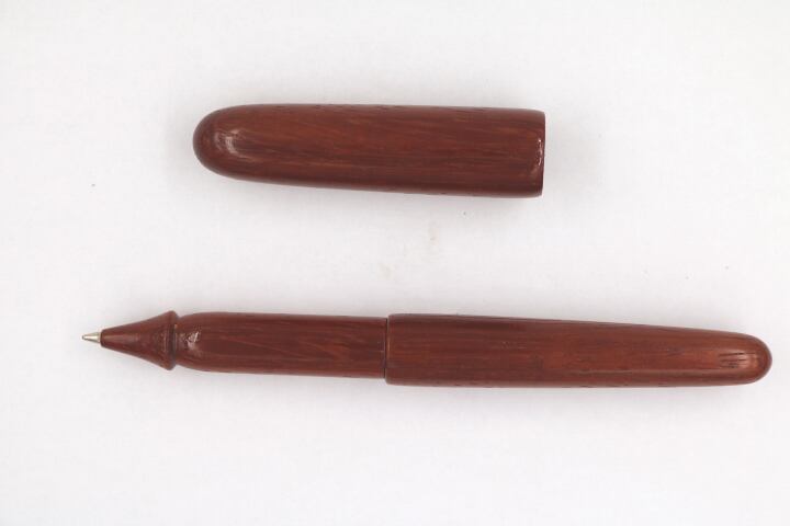 カリンの仲間。外材の大径木の中では比較的柔らかく加工しやすい木。マリンバなどの打楽器にも使用される。そのような材料を素材に伝統工法轆轤を駆使して製作した手作りボールペンです。替え芯はヨーロッパのスタンダードサイズを採用。