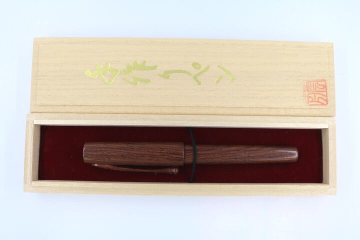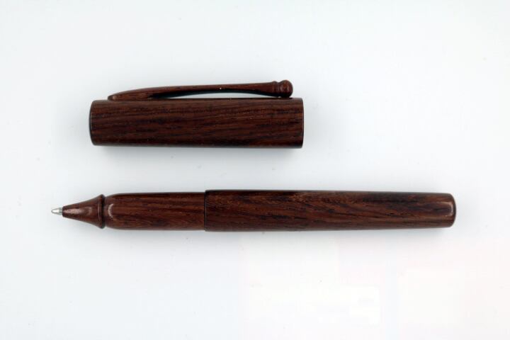 黒檀・鉄刀木と並んで三大唐木の一つでローズウッドの仲間。古渡紫檀、中渡紫檀、新渡紫檀と色味もいろいろ存在する。そのような材料を素材に伝統工法轆轤を駆使して製作した手作りボールペンです。替え芯はヨーロッパのスタンダードサイズを採用。