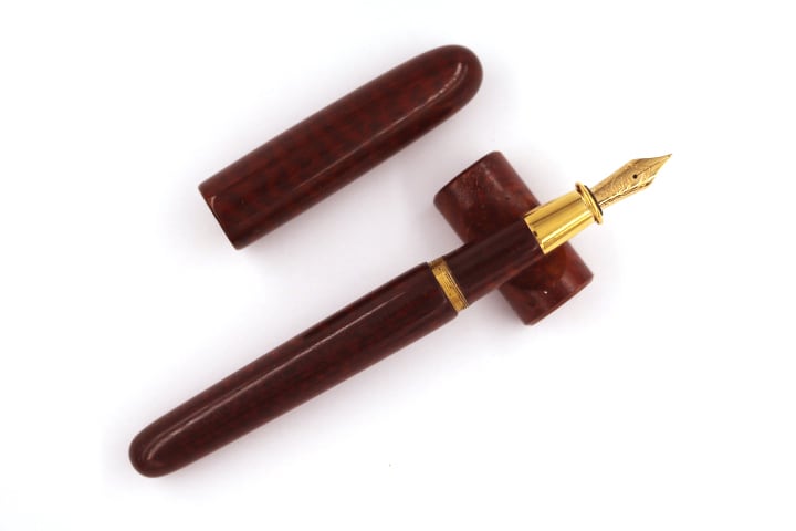 南米北部に生息する広葉樹。世界で最も重たくて硬い木の一つ。レターウッド、レパードウッドとも呼ばれている。この材で作られたステッキは最高級品。そのような材を素材に、伝統工法轆轤を駆使して製作した手作り万年筆です。