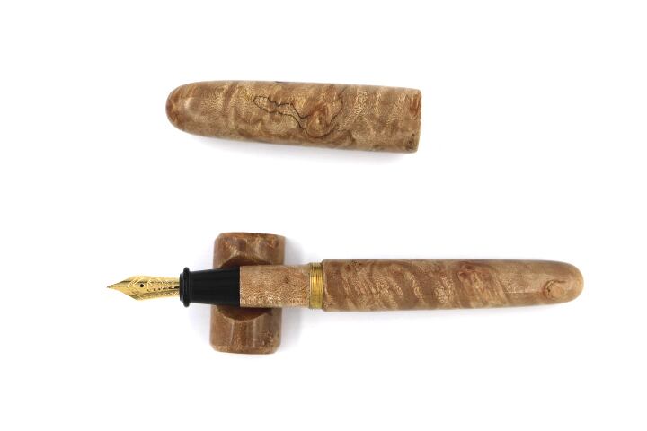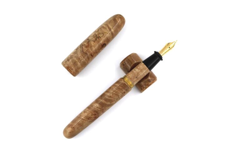 全国でとれる広葉樹、板屋楓のコブの部分。目がきめ細かく緻密。木肌も滑らか。そのような材を素材に、伝統工法轆轤を駆使して製作した手作り万年筆です。